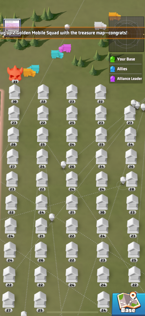 This image shows a grid that is not a grid. Your base is a 3×3 tile area. Each base should line up, with no spaces, to it’s neighbor. Corner to corner, just as how the placement is in this photo. If the grid is out of whack, do not move there! Wait until the other players line up or choose a different spot.